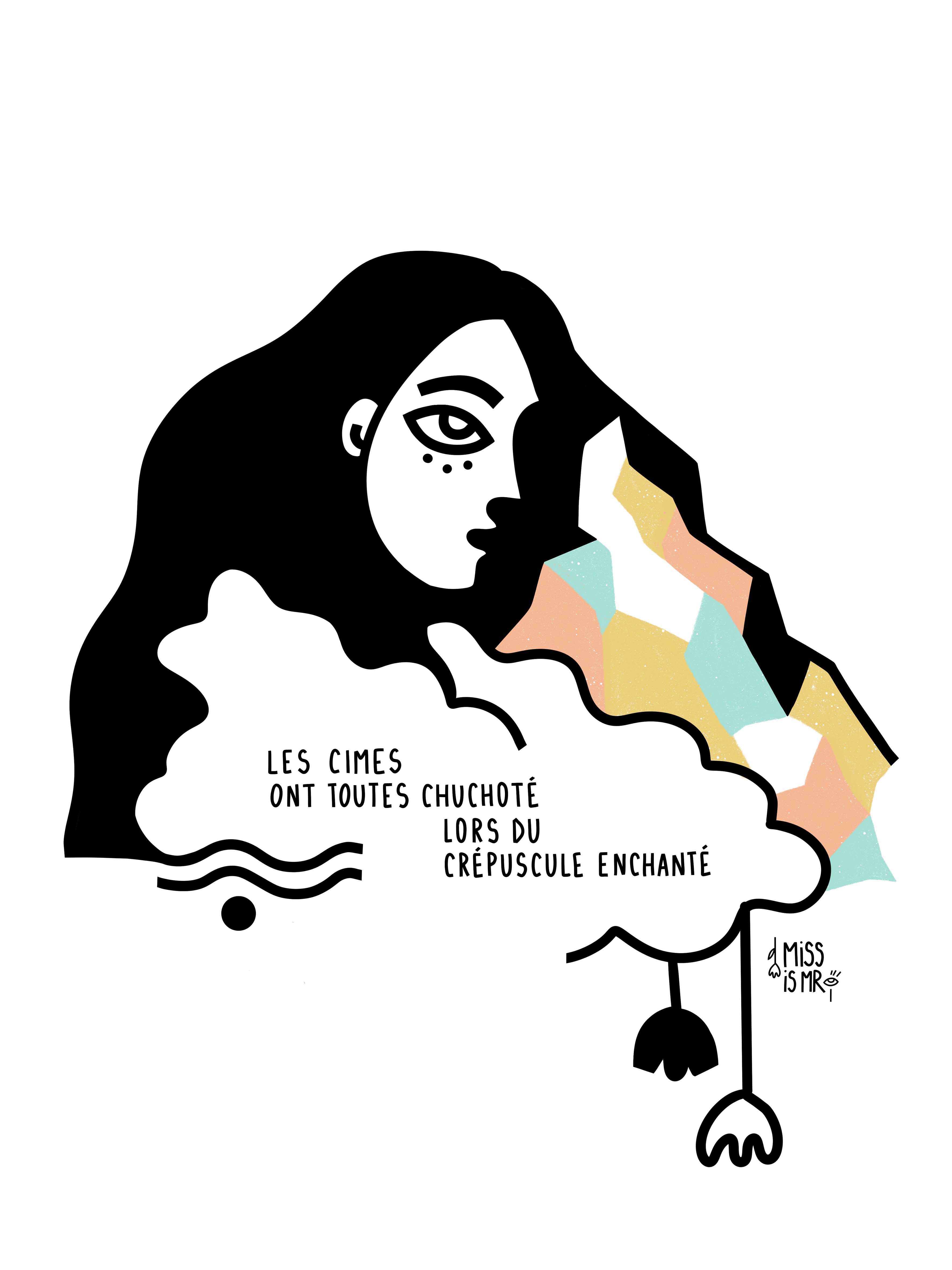 I regularly create illustration series inspired by the wild world, mountain landscapes, movement, bodies, plants, symbols and women. I particularly like working with color and words to imagine moments of escape or freedom.